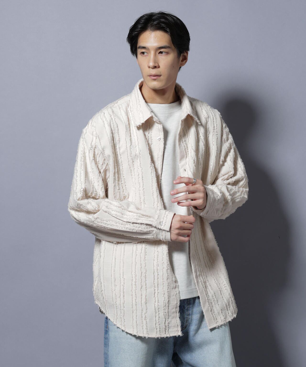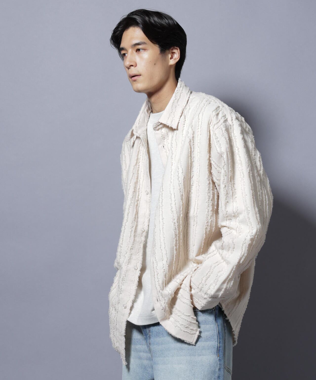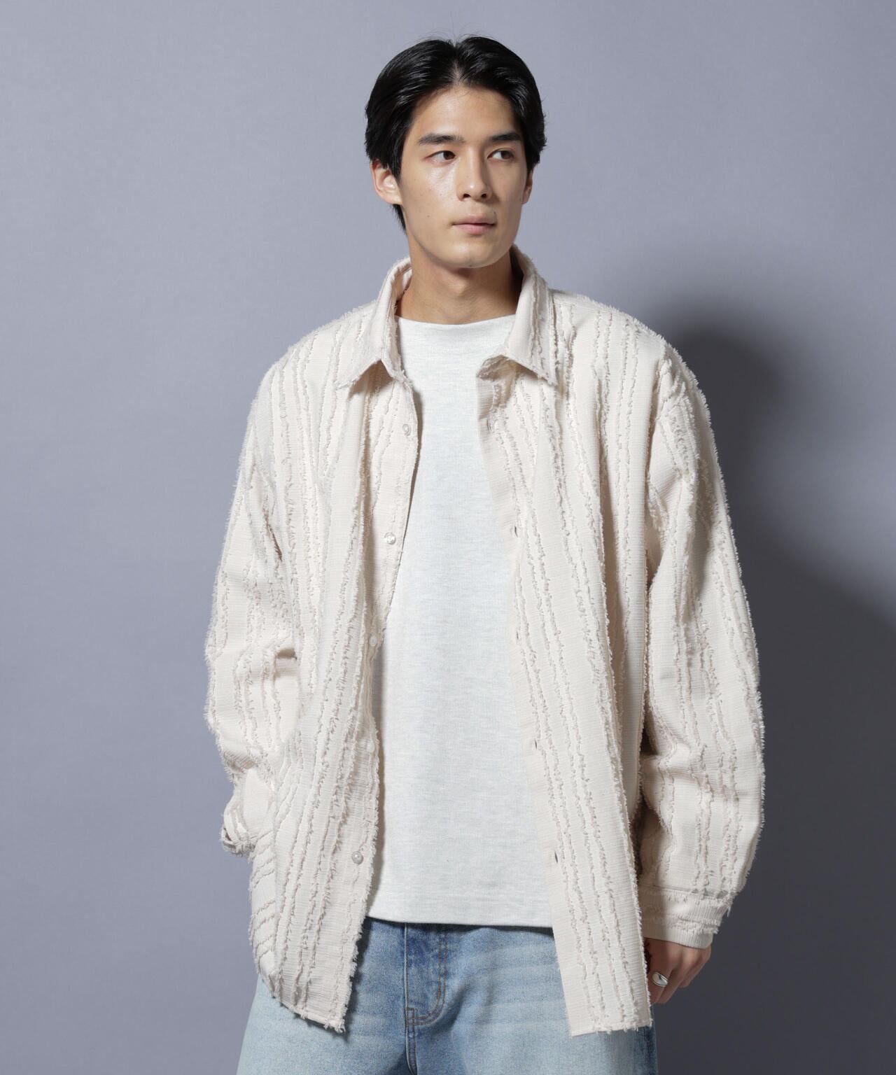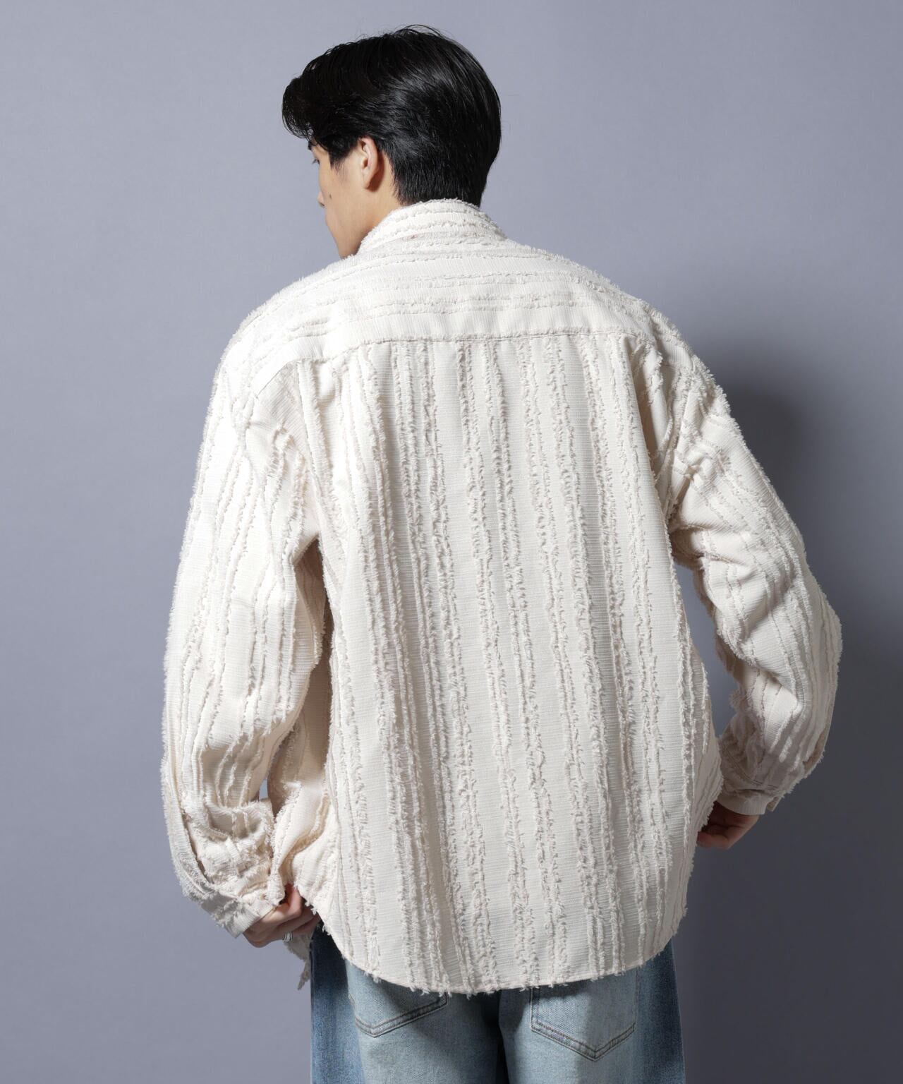 フリンジのようなテクスチャーが魅力のオーバーシャツ。カットレースと呼ばれる生地を織り上げた後に糸を断ち切り、フリンジのような素材に仕上げた特殊な素材を使用。スタイリングのアクセントになるおすすめの1着です。